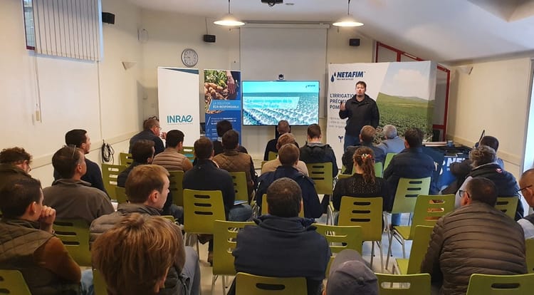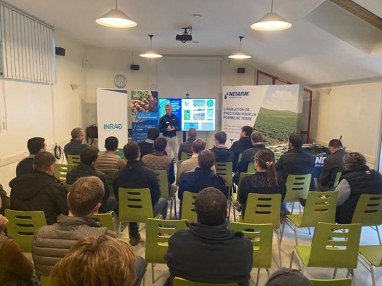 Ensuite, Bruno Costa, consultant en développement pour le nord de la France, a fait une présentation montrant les avantages et les particularités de l'irrigation goutte à goutte et comment est calculée la quantité et la fréquence d'irrigation du point de vue de l'irrigation goutte à goutte ! Après cela, il a également présenté les solutions Netafim en tenant compte de l'adaptabilité à chaque secteur, type de sol et aussi de la mécanisation, suivi des résultats que Netafim a recueillis dans des essais et des parcelles commerciales en France au cours des dernières années ! L'un des résultats clés a été les résultats exceptionnels de l'essai réalisé en partenariat avec McCain où la solution goutte à goutte a été comparée à l’enrouleur ! Dans ce cas, le rendement a augmenté de 23 % (de 47 t/ha à 58 t/ha) tandis que la consommation d'eau a diminué de 19 %, ce qui se traduit par une augmentation de 53 % de l'efficacité de l'utilisation de l'eau ! Il a également été signalé une grosse différence de taille et d'uniformité ! Cela, compte tenu d'une année très compliquée sur le plan climatique, démontre la capacité de la micro-irrigation à fournir d'excellents résultats et à économiser des ressources en même temps ! La présentation s'est terminée par le témoignage vidéo de M. Charles Hébert, fermes de pommes de terre de semence en Normandie !