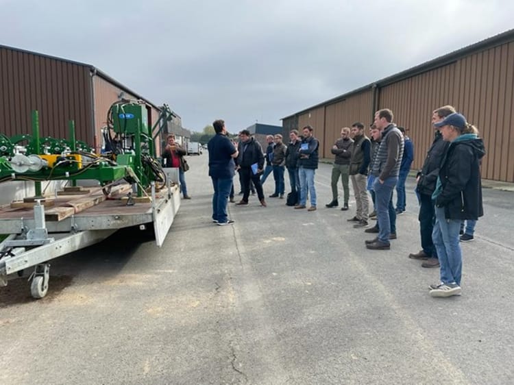 Les participants se sont retrouvés à l'extérieur pour voir les machines utilisées pour installer et récupérer les goutteurs et en savoir un peu plus sur la fonctionnalité et les enjeux de cette opération.