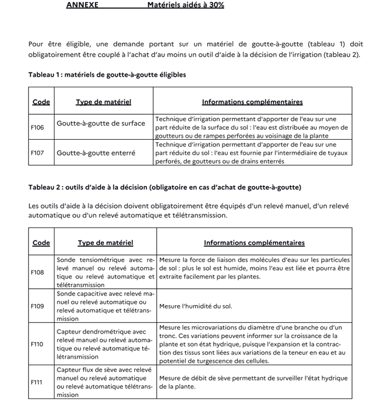 Il doit y avoir au moins un matériel d'irrigation (goutte à goutte de surface ou enterré) et un outil d'aide à la décision (sonde, capteur…).