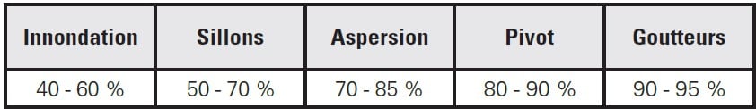 La micro-irrigation constituée d’un système goutte à goutte est désormais reconnue comme étant la plus efficace comme le montre ce tableau ci-dessous que l’on trouve dans beaucoup de sources bibliographiques :